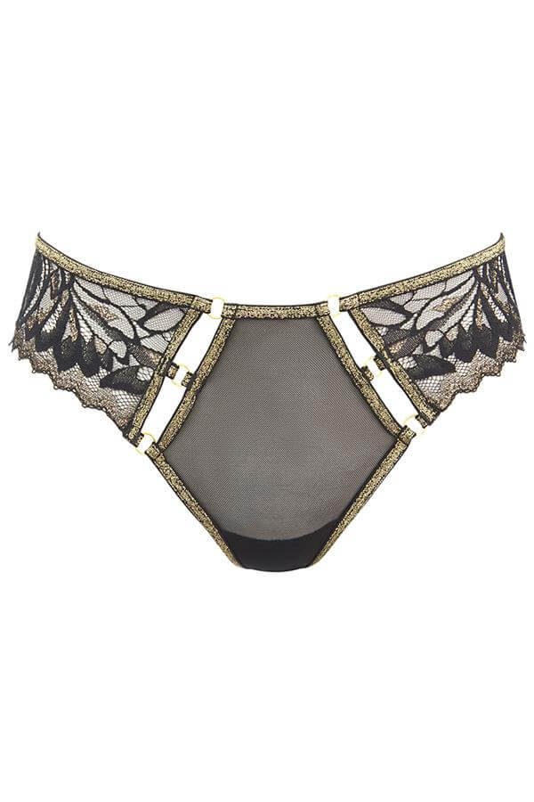 Elegante string met golvende kanten randjes met gouden accenten. De losse delen van de string zijn middels metalen ringetjes met elkaar verbonden. De glinsterende gouden bandjes zijn elastisch en zorgen dat de string lekker zit.