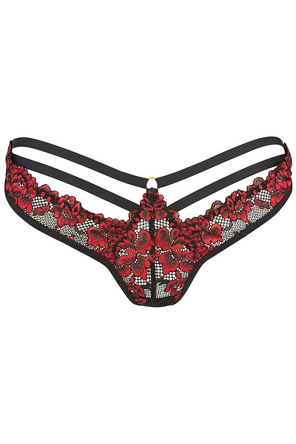 Deze chique, extravagante, rood met zwarte string is een must have in uw garderobe! De string heeft een hoog uitgesneden voorkant en twee straps die zijn verbonden met een gouden ring. De doorzichtige achterkant is klassiek en comfortabel.