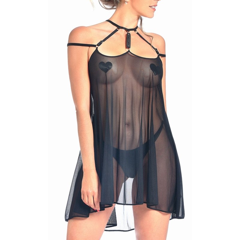 Super sexy transparant jurkje uit de collectie van Petite Follies. Dit luchtige jurkje valt speels over je lichaam. Het mooie lijnenspel van bandjes aan de bovenkant maakt dit jurkje echt bijzonder. Vanzelfsprekend zijn de bandjes verstelbaar. Er zitten ook strass steentjes op het middelste vertikale bandje. Prachtig te dragen met lingerie of gewoon zo…
