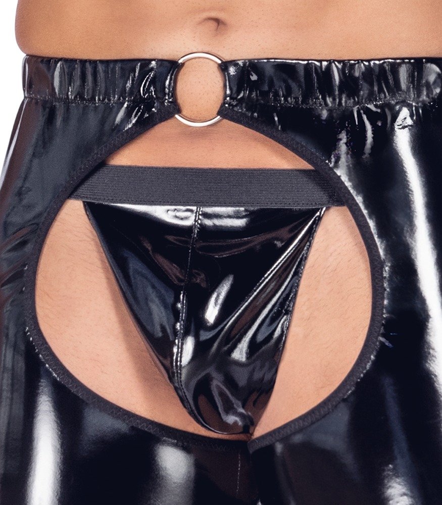 De strakke, broekspijpen van lak sluiten nauw aan voor een krachtige, sexy look, terwijl de open kruis en billen zorgen voor verleiding. De elastische tailleband met decoratieve ring maakt het geheel af .