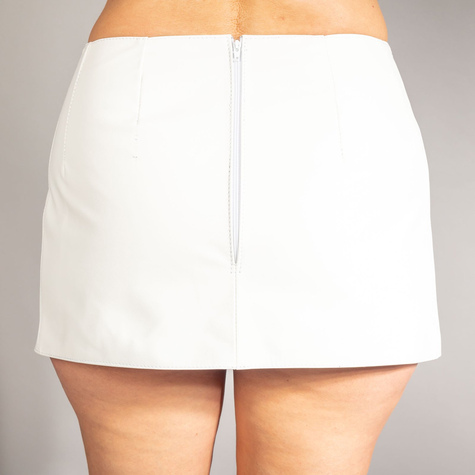 Dit prachtige rokje heeft aan de zijkanten 2 splitten die door middel van 7 metalen buisjes aan elkaar gehouden worden. Er zit een rits aan de achterzijde. De lengte van deze exclusieve mini rok is 31 cm.