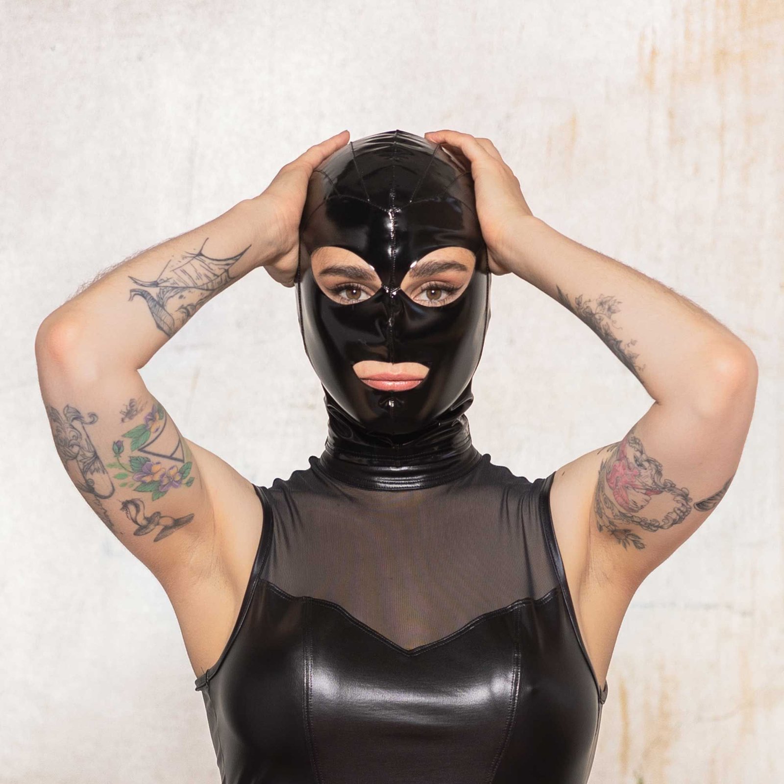 Nauwsluitend masker gemaakt van lak. Met gaten voor de mond en ogen. De achterzijde van het masker heeft een rits om het aan- en uitdoen makkelijk te maken.