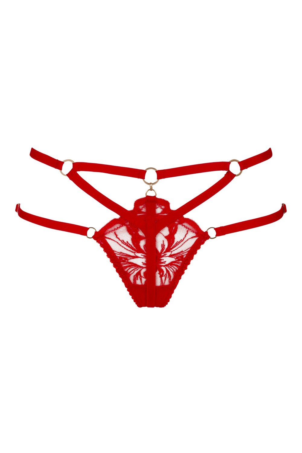 De Eleonor string is ontworpen voor wie durft. Gemaakt van fijn rood borduursel dat het front siert met een verleidelijk patroon – sensueel én verfijnd. Deze string laat niets aan het toeval over, maar speelt juist met contrasten: romantiek aan de voorkant, strappy boldness aan de achterkant.