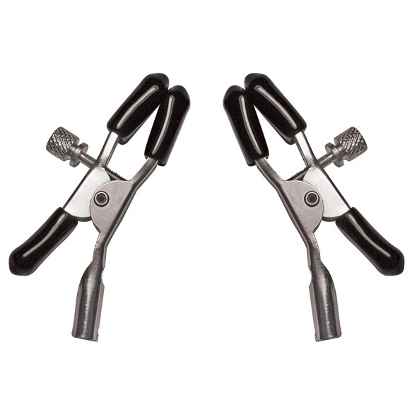 Deze verstelbare klassieke tepelklemmen zijn ideaal om elke slaaf mee te prikkelen. Ze zijn makkelijk op te schroeven voor meer of minder intense prikkels. De klemmen zijn via een ketting verbonden aan een decoratieve “SLAVE” hanger